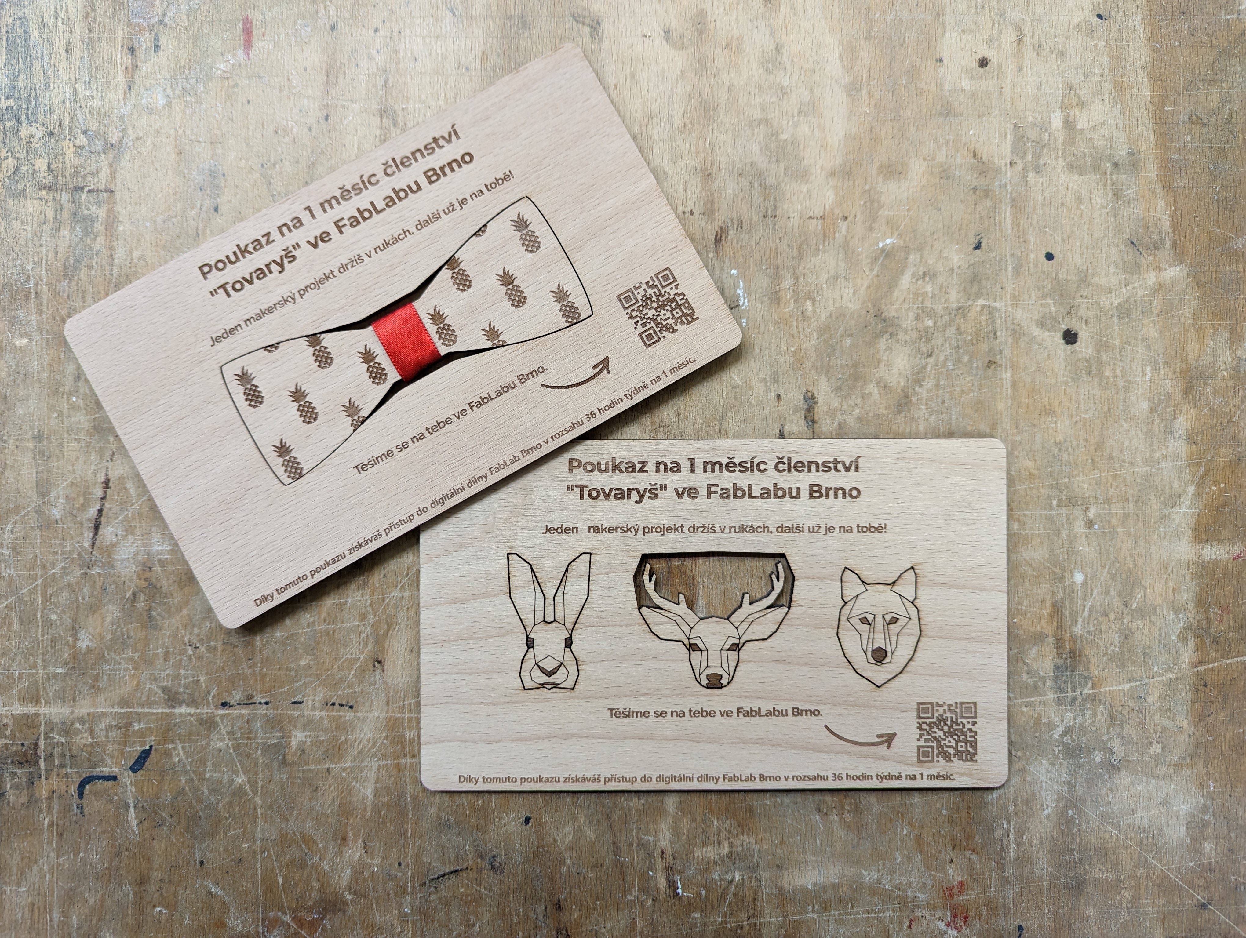 - dárkový poukaz z bukové překližky, jehož součástí je buď dřevěný motýlek nebo sada tří broží,